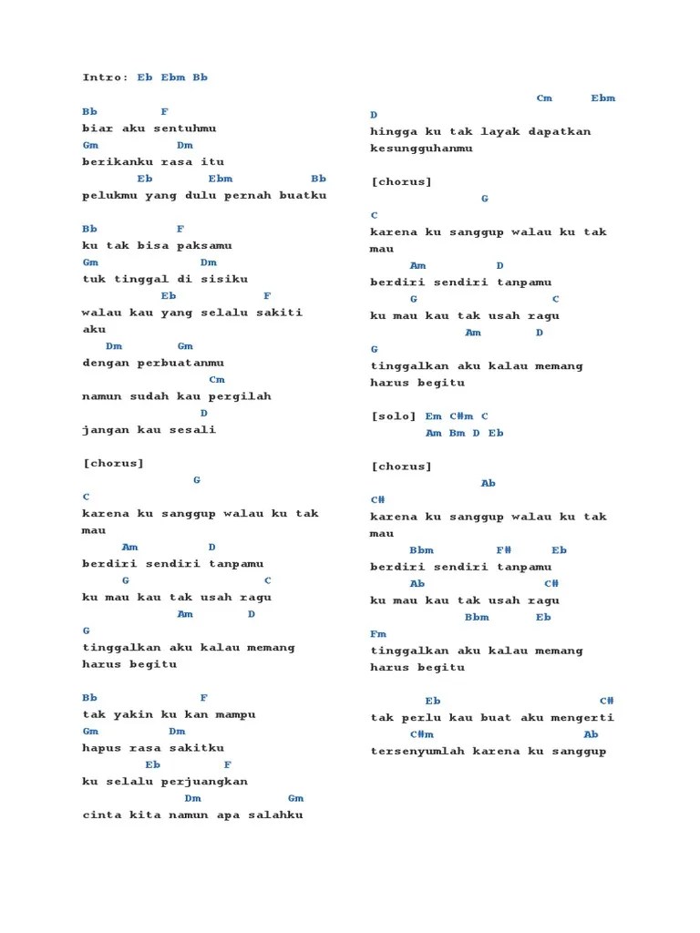 Eb ebm bb bb f biar aku sentuhmu gm dm berikanku rasa itu eb ebm bb pelukmu yang dulu pernah buatku bb f ku tak bisa paksamu gm dm tuk tinggal di sisiku eb f walau kau yang selalu sakiti aku dm gm dengan perbuatanmu cm namun sudah kau pergilah d jangan kau sesali chorus g c karena ku sanggup walau ku tak mau am d berdiri sendiri tanpamu g c ku.